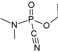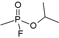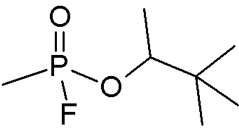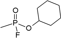 Molecules of sarin, soman, cyclosarin have a strong similarity and related to one chemical group of the organophosphorus CAs, as P‑F bond is responsible for activity in them. There also is one bond with hydrocarbon radical P‑R and other bond with alcohol residual P‑OR (ester group) in them. Among themselves these three molecules differ only by alcohol residuals OR (specified under the formulas, cyclosarin was not manufactured in large quantities because of relative high price of corresponding alcohol [7]). Compounds of this type (containing one bond P‑R) are termed phosphonates (or phosphonyl compounds, in this case – phosphonyl fluorides). Molecule of tabun strongly differs from molecules of other substances of the G group. P‑C≡N bond is responsible for activity in it, and this is the only organophosphorus CA with similar bond. Therefore assignment of tabun to the G group is conditional (historical), from the chemical point of view it is a representative of separate chemical group of the organophosphorus CAs.