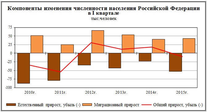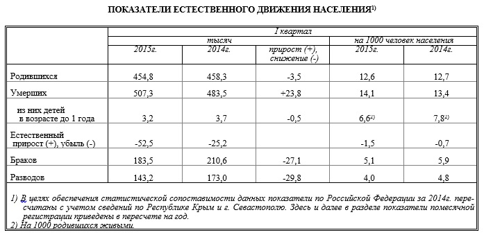 Предварительные итоги: за январь-март 2015г. зафиксирован более чем двукратный рост темпов вымирания населения России – чистая убыль граждан России выросла до 52,5 тыс. человек по сравнению с 25,2 тыс. годом ранее! В расчёте на 1000 граждан России естественная убыль увеличилась с 0,7 до 1,5 человек. Подобных темпов вымирания населения не наблюдалось более 3 лет. Об этом удручающем результате своей деятельности глава Правительства предпочёл не сообщать во время отчёта в Госдуме – гордиться депопуляцией и вымиранием России цинично и запретительно даже для реформаторов гайдаровского пошиба.