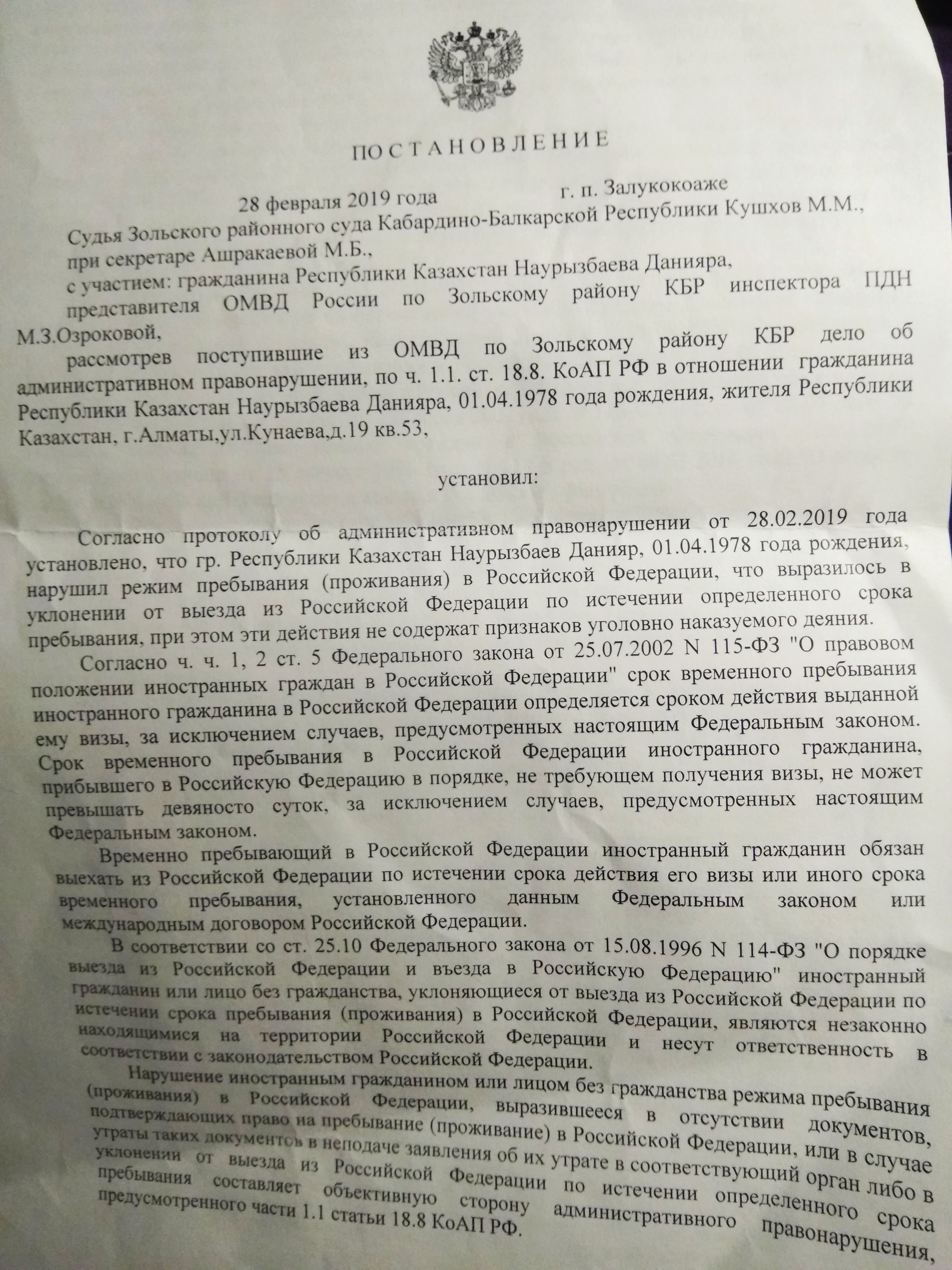 Но, к сожалению, не всё так благополучно в сфере российской миграционной политики. В конце февраля 2019 года автору этих строк пришлось убедиться в этом на своём опыте. Будучи законопослушным гражданином Казахстана, постарался покинуть российскую территорию до истечения 90-дневного срока на автобусе международного сообщения по маршруту «Москва-Ереван». Однако немного ошибся в расчётах, и превысил законный срок на несколько часов. И вот, в паре сотен километров от российско-грузинской границы, был ссажен с автобуса на ФКПП «Малка» в Кабардино-Балкарии, в сопровождении вооруженного конвоя был доставлен в местное отделение полиции и предан суду. Итогом этой многоходовой комбинации стал административный штраф.