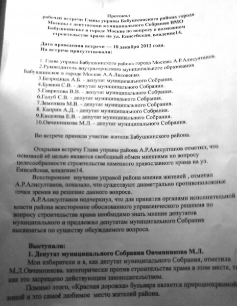 Затем в 2012 году РПЦ была предпринята еще одна попытка застроить наш сквер, однако после вмешательства межрайонного прокурора и депутатов, и эта попытка была пресечена. У нас сохранился протокол рабочей встречи главы Управы Бабушкинского района с депутатами муниципального собрания ВМО Бабушкинское по вопросу строительства храма на ул. Енисейская, влд. 14, от 10 декабря 2012 года. Во встрече приняли участие жители района, собравшие более трех тысяч подписей против незаконного строительства . Тогда все депутаты высказались против строительства в сквере и направили префекту СВАО информационное письмо о нецелесообразности строительства, за что ваши избиратели вам благодарны.