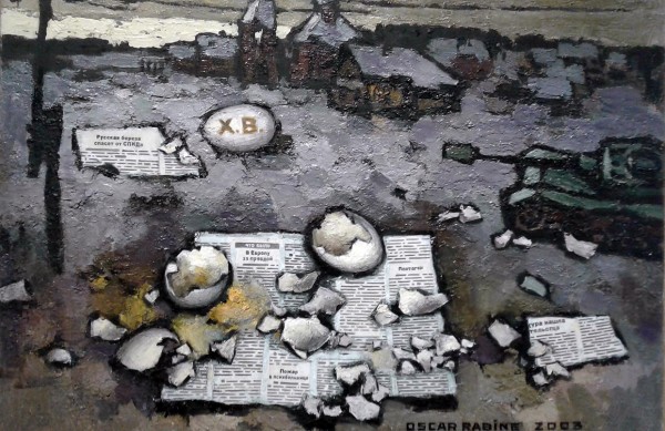 Собственно, почему я вспомнил ту давнюю выставку, давно упакованную в ячейку памяти «прошлая жизнь»? Потому что недавно, гуляя по той же выставке достижений среди богато отреставрированного ампира, я увидел на павильоне «Культура» рекламу художественной выставки – три художника под одной крышей. Про двух я никогда не слышал, оказалось, так, мазня, а третьим был тот самый Оскар Рабин, словно явившийся на машине времени из социалистического далека в наше время с ревизией. Ну что, сынки, помогла вам ваша перестройка, гласность и все такое? Доложите, что вы натворили тут за сорок с лишним лет, а? Подняли рабочего и его колхозницу на недосягаемую высоту, завели вместо тов. Налбадяна тов. Церетели?.. Молодцы, ребята, вы славно потрудились!