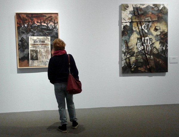 Сегодняшняя рабинская экспозиция оказалось не очень большой, полотен двадцать, знаменитых «Рубля» и «Паспорта» не было, взамен была «Виза» и другие парижские работы, но выполненные в том же мрачном стиле 60-х, что смотрелось довольно натужно: при всех язвах капитализма Париж – это все-таки не Лианозово. Но было и Россия - та, старая 60-70-х и современная, которая отличалась только иными реалиями, но никак не общим угрюмым колоритом. «Улица имени Пресвятой Богородицы», колбаса на мятой газетке с заголовком «Национальная идея – православие», пасхальные яйца и другие сегодняшние реалии. «Российская береза спасет от СПИДа». Что тут скажешь!? Старая гвардия – глаз алмаз.