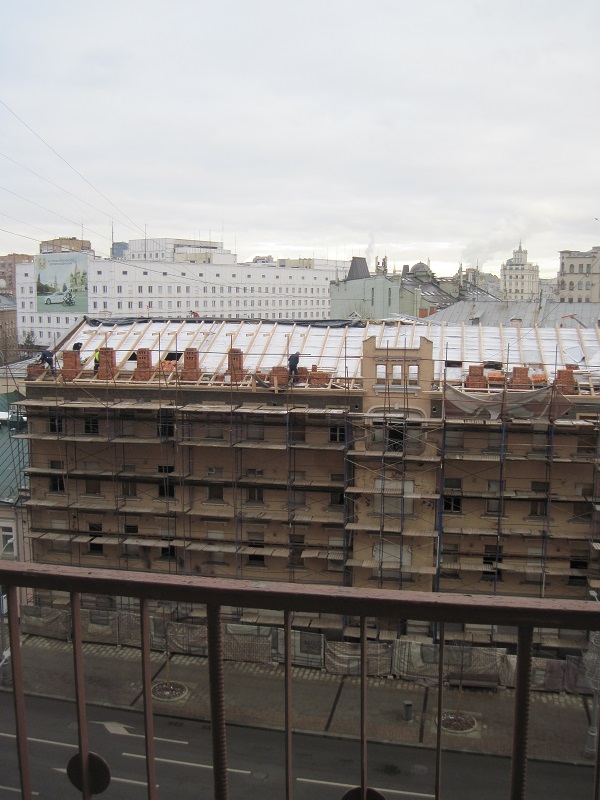 Нет, это совсем не тот случай, когда мы желаем позлорадствовать - это же наша среда обитания, культурный родник, одно из модерновых лиц столицы (начала ХХ века), и сейчас его приводят в приличный вид (сперва, как я понял по ходу работ, - изнутри, а потом уже и наружностью займутся). Первым делом создали монолитную платформу под будущей крышей - на этажах, видимо, тоже. Это, кстати, обезопасило здание от дальнейших провалов (снег и был фактором обрушения перекрытий в 2015-м весной). Сейчас вот кровлю завершают и утепляют - да, в самое неподходящее в плане сезона время, но насчёт снега и намокания обрешётки бог миловал, погодка в нынешнюю зиму довольно-таки сухая...