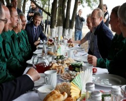 Путин поел борща с комбайнерами из фарфоровой тарелки