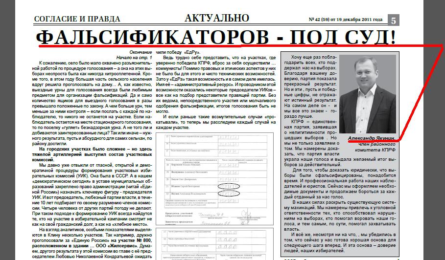 Кандидаты-конкуренты единоросса, жаловались на многочисленные нарушения с самого начала избирательной кампании. Но больше всех и громче всех кричал, ставший вторым на выборах после С.Юдакова, представитель КПРФ уроженец г.Клин Александр Якунин. Представляемая им группа, известная как «ильинцы», стала героями многих публикаций, но сейчас речь о статьях в их собственной газете «Согласие и правда». После выборов «ильинцы» заявлять о многочисленных нарушениях стали еще громче. Например, в статье под заголовком «Фальсификаторов под суд!» где А.Якунин заявил: