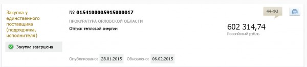 28.01.2015 года прокуратура области разместила на сайте закупок извещение о проведении закупки №0154100005915000017 у единственного поставщика тепловой энергии на 2015 год на сумму, ахтунг!, 602 314,74 рублей (Шестьсот две тысячи триста четырнадцать рублей 74 коп.).