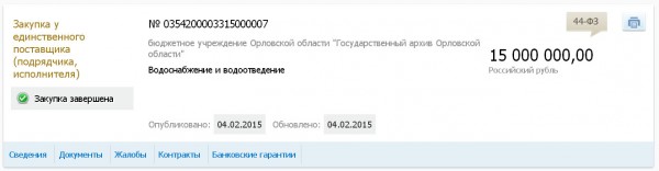 На фоне этого масштабного распила орловского регионального бюджета как-то несолидно смотрится извещение областного архива от 4 февраля 2015 года о закупке №0354200003315000007 у единственного поставщика воды с водотведением на сумму в каких-то жалких 15 000 000 рублей.