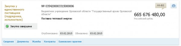 3 февраля 2015 года бюджетное учреждение Орловской области "Государственный архив Орловской области"разместило на сайте закупок извещение о проведении закупки №0354200003315000006 у единственного поставщика тепловой энергии на 2015 год на сумму, ахтунг!, 665 676 480.00 рублей.