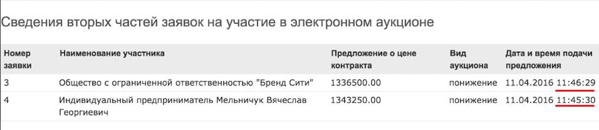 Кроме того, ИП Мельничук участвовал в 2 электронных аукционах с ООО “Спектр”. В обоих случаях Мельничук стал победителем при минимальном проценте снижения цены. Заявки зачастую подавались с разницей в секунду.