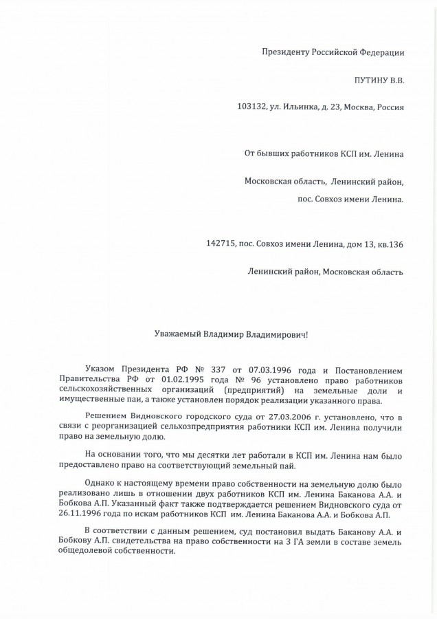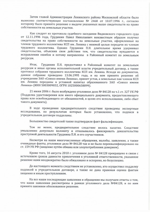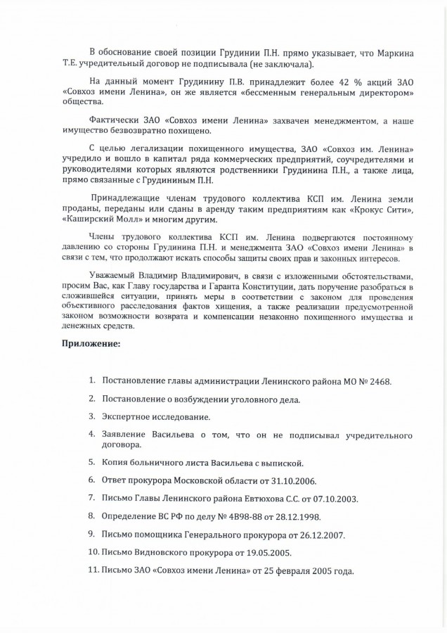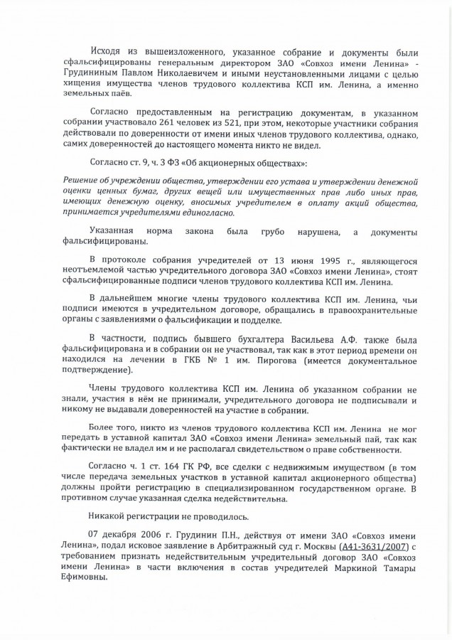 Меж тем, указывается в письме президенту, предприниматель учредил новое предприятие — ЗАО «Совхоз им. Ленина», в уставной капитал которого вошли земельные паи членов КСП им. Ленина, предоставив в Районный комитет по земельным ресурсам учредительный договор и протокол собрания трудового коллектива КСП им. Ленина. Впоследствии было возбуждено уголовное дело, а экспертизы показали, что подписи в учредительном договоре подделаны.
