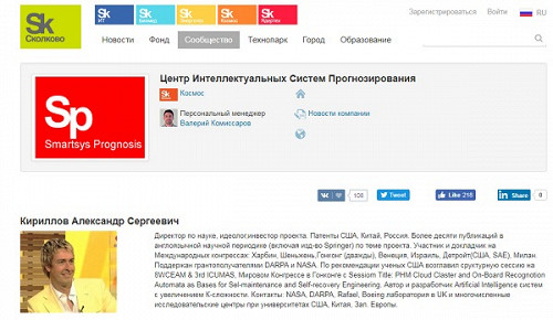 На сайте указано, что Кириллов Александр Сергеевич является директором по науке, идеологом и инвестором проекта Центр Интеллектуальных Систем Прогнозирования (ЦИСП), который числится резидентом "Сколково".