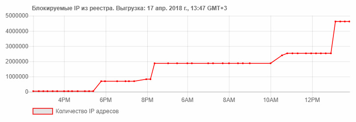 Количество заблокированных IP-адресов в связи с ограничением доступа к Telegram в России к 13:07 мск 17 апреля превысило 4,6 миллиона, следует из данных сайта 2018.schors.spb, ведущего подсчет добавленных в реестр запрещенных сайтов.