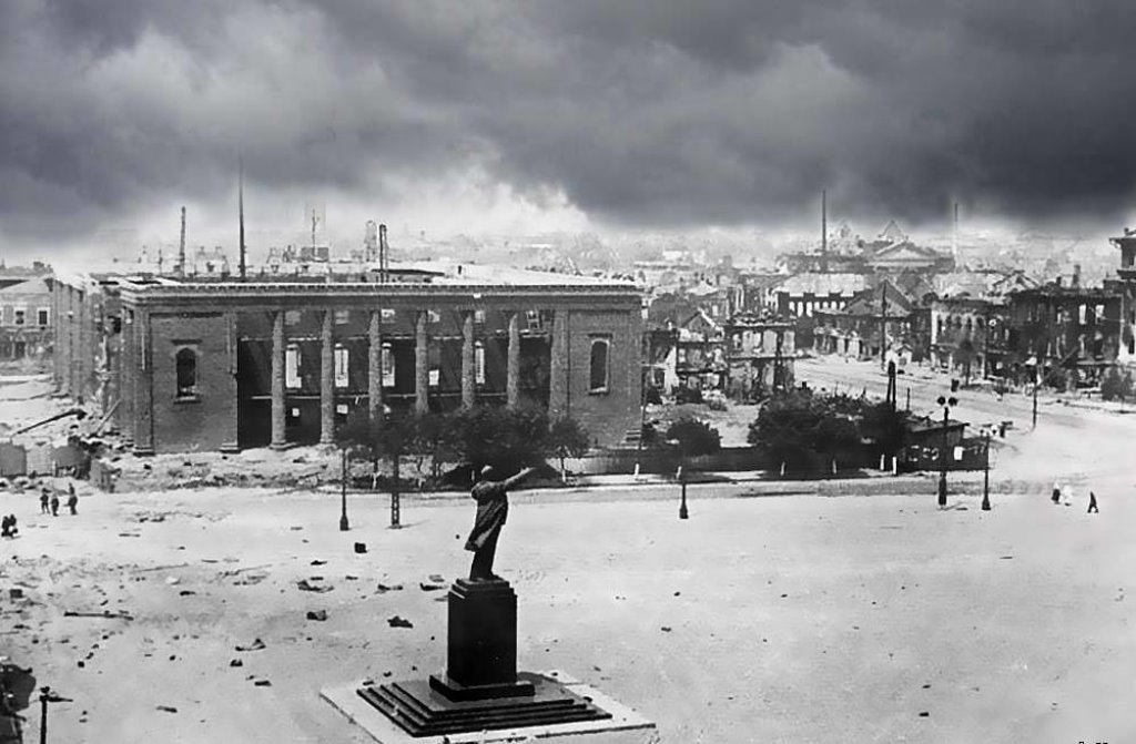 Как выступавший вместе с родным "Эшелоном" на площади и прямо у памятника Ленину в Воронеже 2005-го года, хочу сказать и своё гневное слово. Вот так она, кстати, выглядела в дни немецко-фашистской оккупации - площадь, театр и весь Воронеж. Фото вполне историческое.