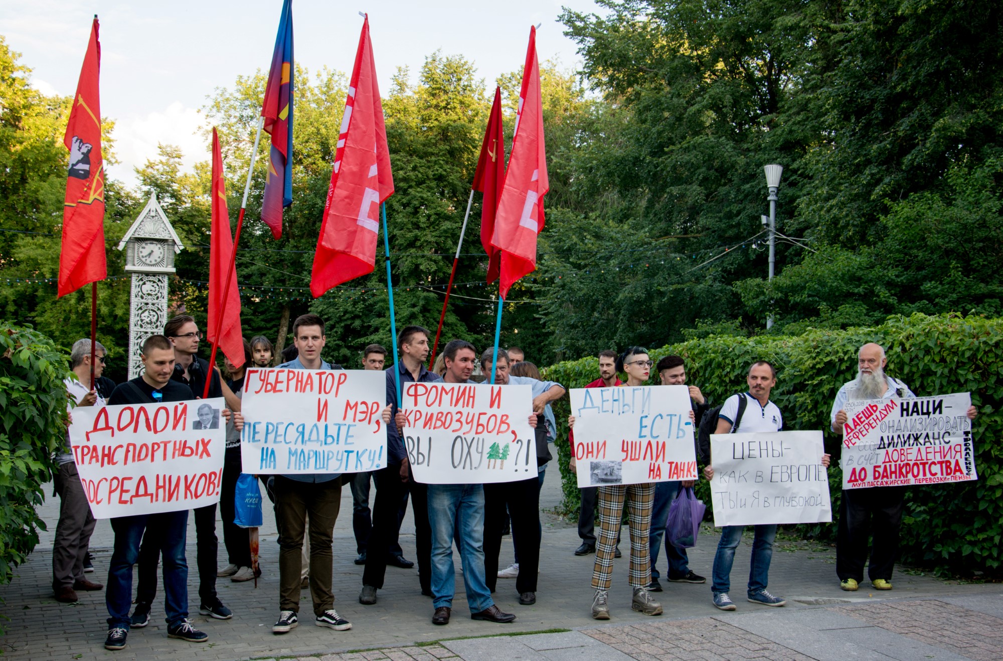 9 июля в Пензе активисты молодежной организации "Поколение Нового Времени" (ПНВ) провели пикет против повышения стоимости проезда в общественном транспорте. Он прошел на улице Московской, возле сквера у часов "Кукушка". К акции протеста присоединились представители Объединенной коммунистической партии (ОКП), пензенские анархисты и неравнодушные граждане.
