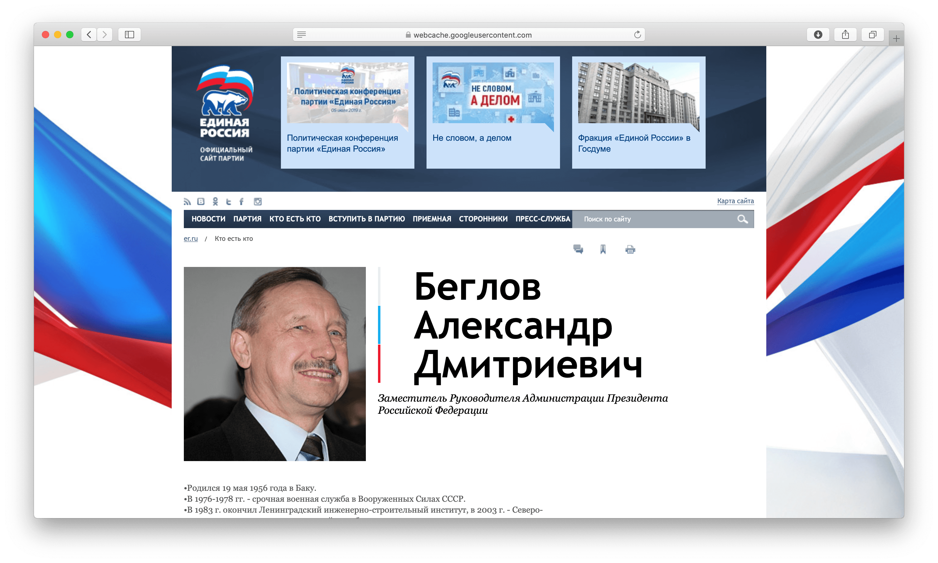 Как сообщает "Новая газета", при попытке зайти на биографию Беглова на сайте ЕР появляется "Ошибка 404", однако в кэше Google сохранилась ее копия. До удаления на странице содержалась краткая биография Беглова, где он упоминался как член высшего совета "Единой России" и бывший глава ее петербургского отделения.