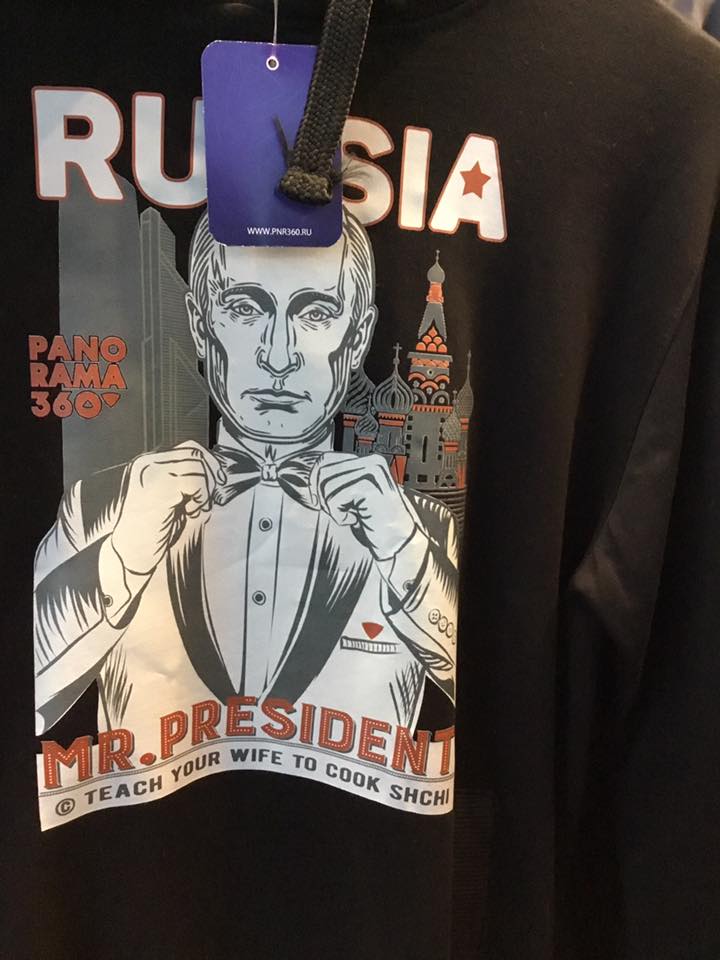В сувенирном киоске — толстовка с картинкой: Путин в галстуке-бабочке на фоне Храма Василия Блаженного с подписью «Mr. President. Teach your wife to cook shchi» (на всякий случай: «Поучи жену щи варить»). Помните, Горбатый это самое Шарапову говорит, когда тот пытается что-то вякнуть, уже находясь в банде? Это я к вопросу о гусейновском определении нынешнего русского языка, если кто не понял. Вот она, самая что ни на есть клоачность. И фон опять же хорош. Shame on us...