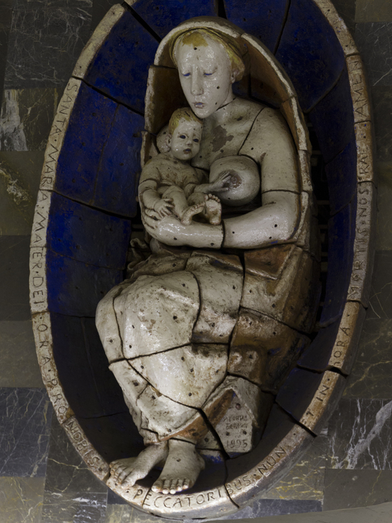 Кстати, обратите внимание на технологию - фрагменты все отдельные, в том числе и злосчастная грудь. Такой "ренессанс-ренессанс", ранний-ранний... Для сравнения: фарфоровые работы Натальи Данько на "Площади Свердлова" ("Театральной") отлиты целиком, хотя до того нигде в мире фарфоровых стутуй в полтора метра не делали. Ну, в общем, прогресс вспять пошел... Мало того, что в бывшем советском метро статуя Девы Марии, так еще и по технологии древней, как повозка с волами - и все равно нашелся мужественный реконструктор, который и ее обколол.