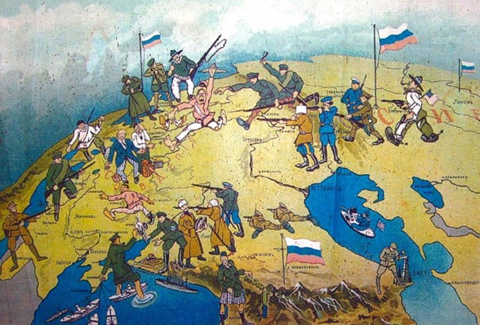 На одном из известных белогвардейских плакатов нарисована карта России. Мечущихся в ужасе красных ("правительство Ленина и Троцкого") со всех сторон окружили белые и тщательно, прямо любовно вырисованные иностранцы, подробно перечисленные на полях плаката: поляки... финны... англичане и американцы на Севере... англичане на Кавказе... англичане на Каспийском море... англичане, американцы, японцы в Сибири...