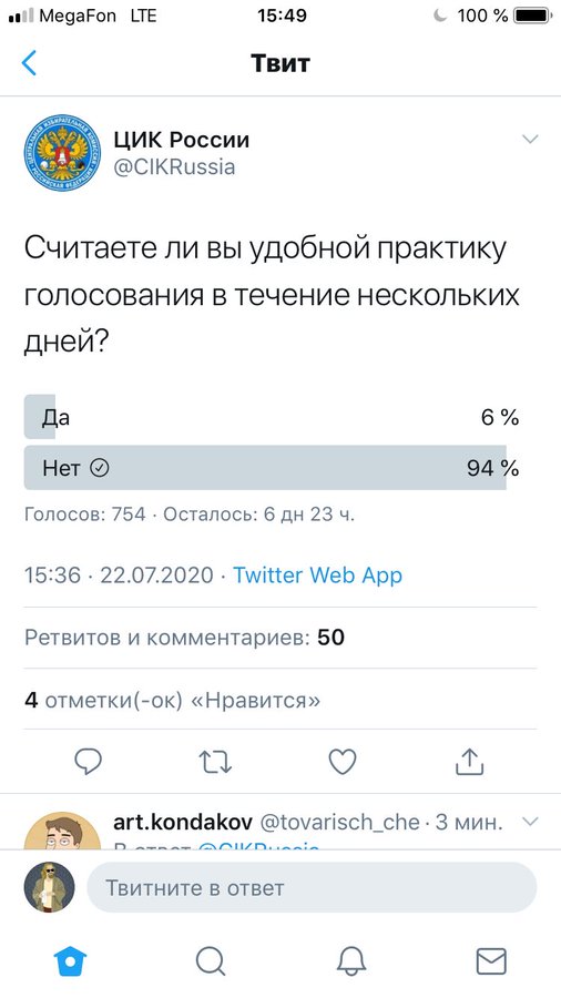 На сохранившихся скриншотах видно, что по состоянию на 15:49 мск в опросе ЦИК приняли участие 754 пользователя. Из них только 6% одобрили новый порядок голосования.