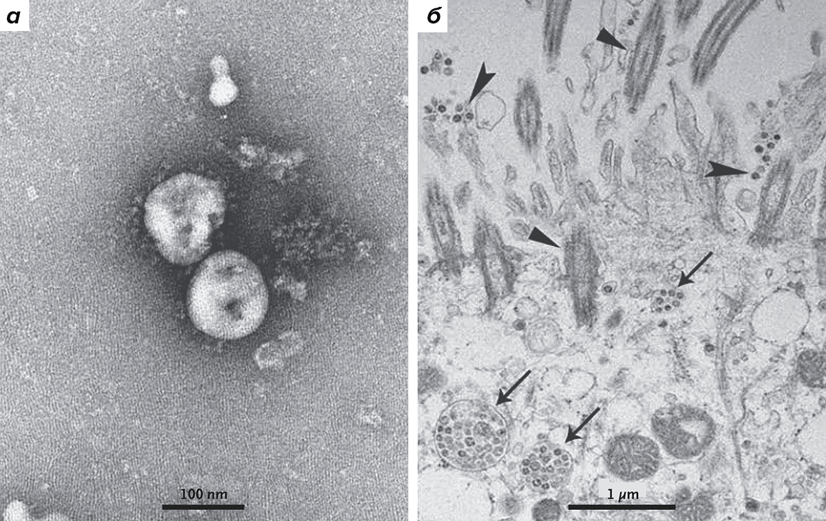 Visualization of 2019-nCoV with Transmission Electron Microscopy (Визуализация 2019-nCoV с помощью трансмиссионной электронной микроскопии: изолированные частицы вируса (слева) и вирус в клетках дыхательных путей человека (справа) отмечен стрелками)