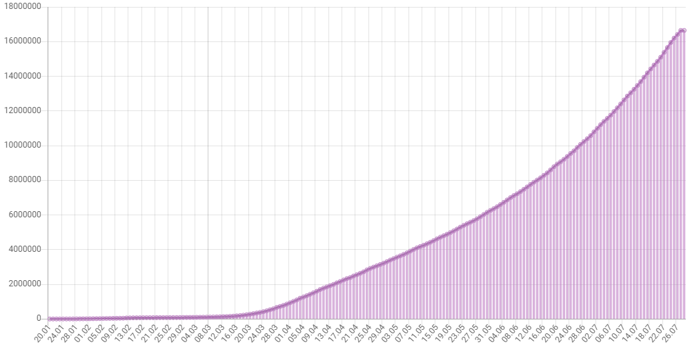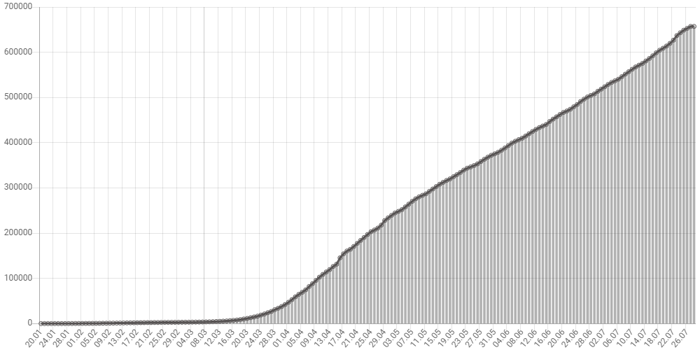 На таком фоне вполне понятно, что когда ВОЗ столкнулась с такого же типа инфекцией, но гораздо более контагиозной, то была объявлена пандемия. На сегодня в мире выявлено 16 641 291 случаев COVID-19, а это совсем иная картина. 657 032 умерших, целая армия такой страны, как Россия.