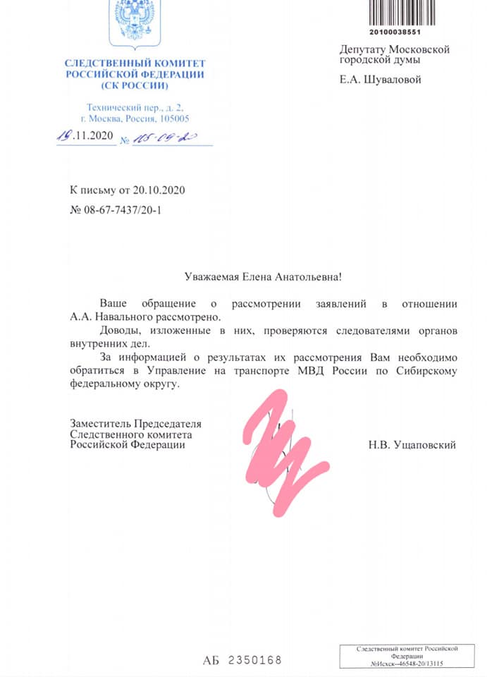 Мной получен ответ на мои запросы и настойчивые требования возбудить уголовное дело по факту отравления Алексея Навального от Заместителя Председателя Следственного Комитета Российской Федерации Н.В.Ушаповского.