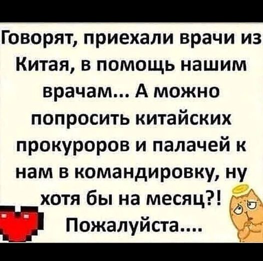 Поэтому пока остается только шутить и выдвигать, например, инициативу по приглашению в Россию китайских прокуроров, судей и палачей, раз уж путинская медицина не смогла справится с ситуацией.