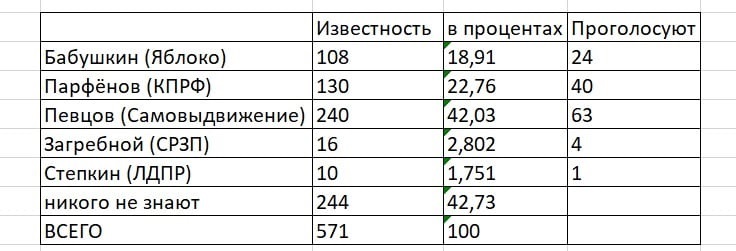 Не могу не отметить, что из 571-го опрошенного готовы пока, гипотетически, проголосовать за известных кандидатов только 132 человека, и то, что 42,7 процента опрошенных не знают вообще ни кого. Таким образом в головах избирателей выборы еще не начинались, по сути... Другие комментарии, заявления, ответы на вопросы, будут после регистрации моей, если она состоится, и других кандидатов. Всем крепкого здоровья, крепкого иммунитета!