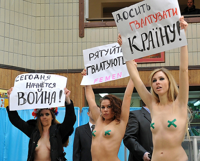 А эти девушки протестовали на избирательном участи топлесом, вполне безобидно.