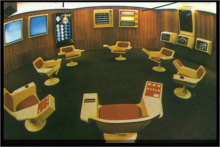 И все же они успели сделать многое! Наладили сеть Кибернет. Стали создавать ситуационную комнату. Конечно, сегодня, во времена огромных плоских дисплеев на жидких кристаллах, вызывают только улыбку тогдашние средства отображения информации - с помощью двухметровых громоздких шкафов с вращающимися стеклянными дисками и лампочками. Но тогда приходилось выкручиваться с помощью несовершенных технологий. Началась проработка системы прямой связи «народ-правительство» с помощью интерактивного телевещания и сети компьютеров для оперативного голосования (так называемой алгедонической цепи).