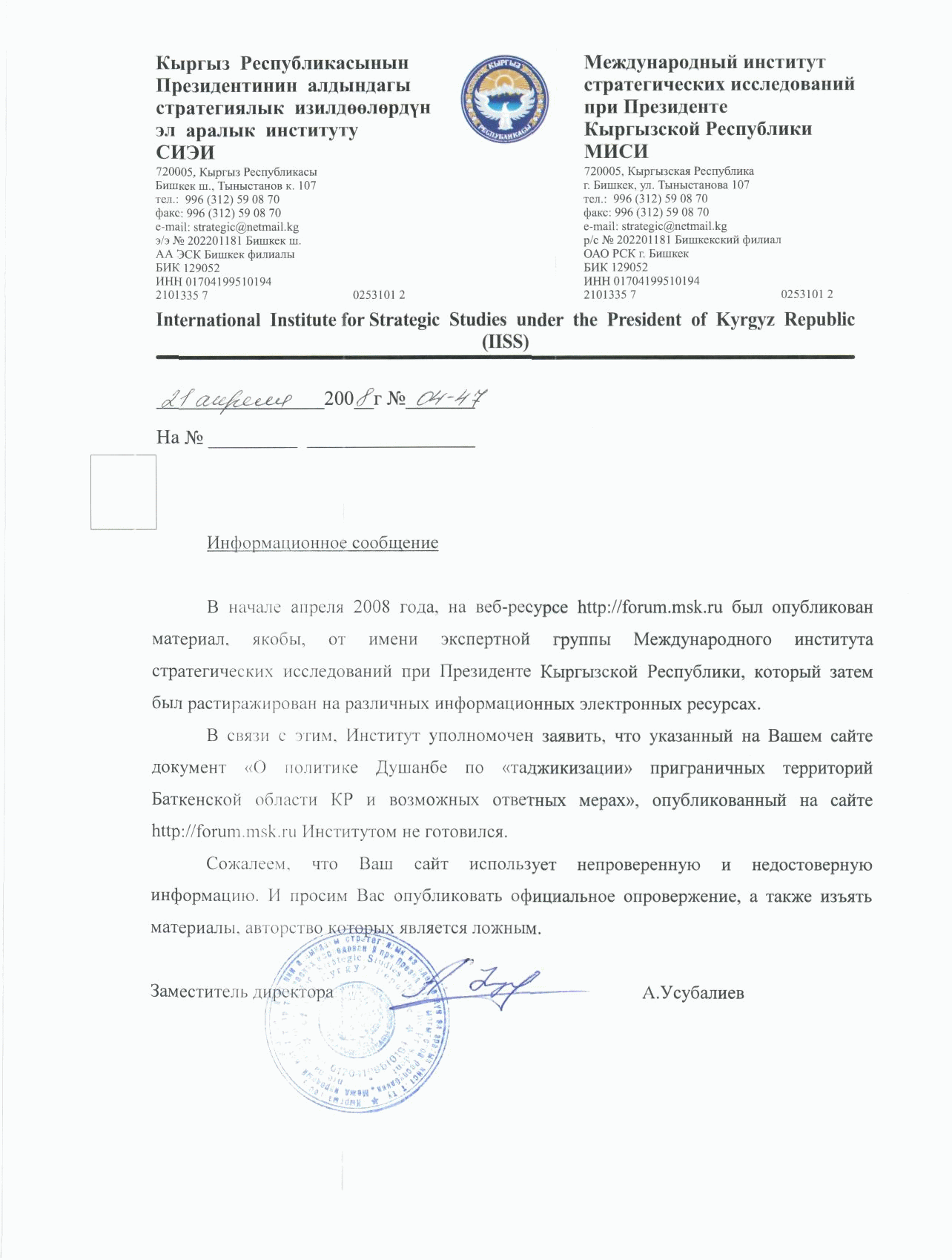 В адрес редакции ФОРУМа.мск поступило письмо, подписанное заместителем директора Международного института стратегических исследование при президенте Киргизии, в котором утверждается, что данный институт не готовил справку "О политике Душанбе по «таджикизации» приграничных территорий Баткенской области Кыргызской Республики и возможных ответных мерах", опубликованную на нашем ресурсе.