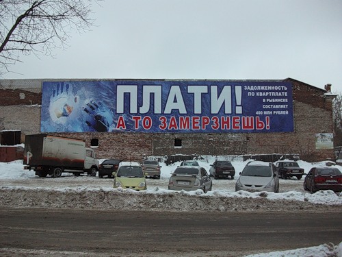 Именно такими плакатами и баннерами украсила Рыбинская администрация город к новому 2011 году. Оно и понятно, на 2011 год бюджет города Рыбинска в дефиците, который составляет 352 миллиона рублей. А тут еще и граждане не хотят платить за услуги ЖКХ. Общий долг по квартплате в Рыбинске составляет 400 млн.