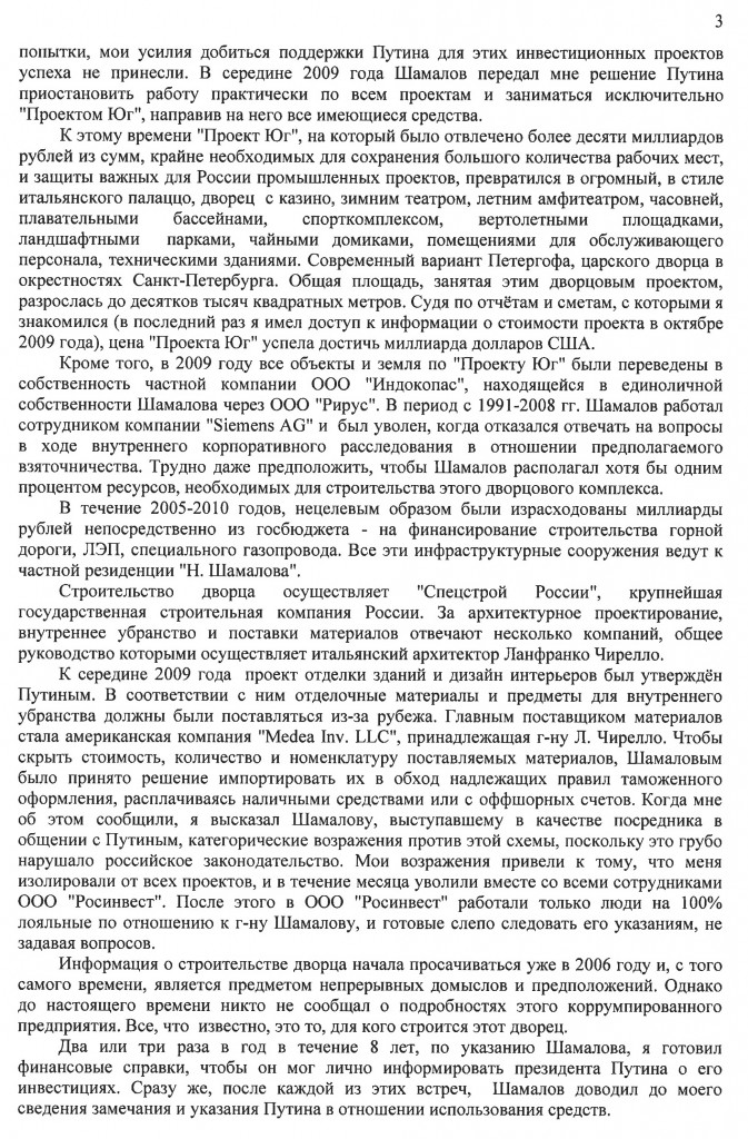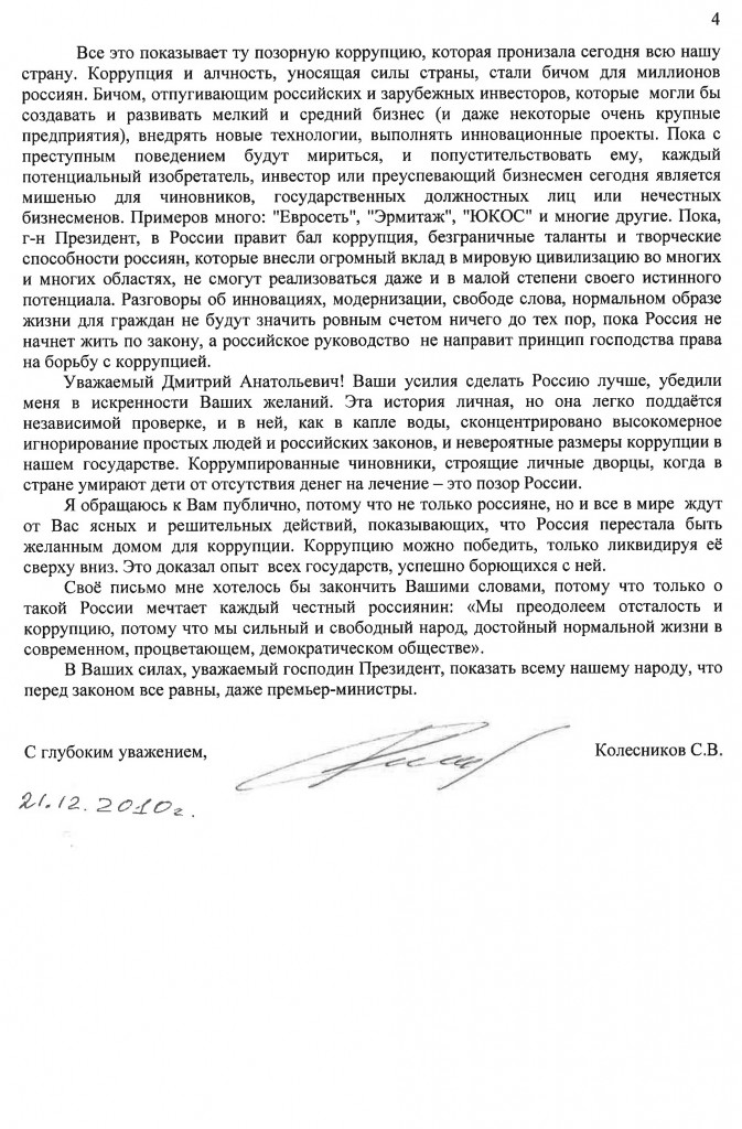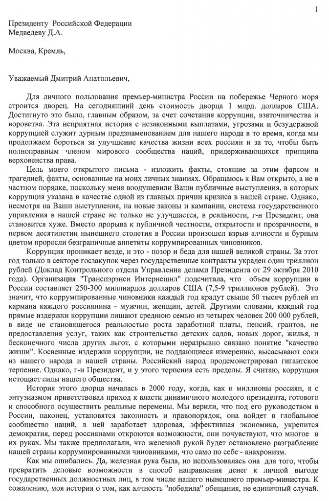 "Уважаемый Дмитрий Анатольевич. Для личного пользования премьер-министра России на побережье Черного моря строится дворец. На сегодняшний день стоимость дворца 1 млрд. долларов США. Достигнуто это было, главным образом, за счет сочетания коррупции, взяточничества и воровства. Эта неприятная история с незаконными выплатами, угрозами и безудержной коррупцией служит дурным предзнаменованием для нашего народа.", - это строки из открытого письма бизнесмена Сергея Колесникова Дмитрию Медведеву. Послание опубликовано на сайте CorruptionFreeRussia.com.