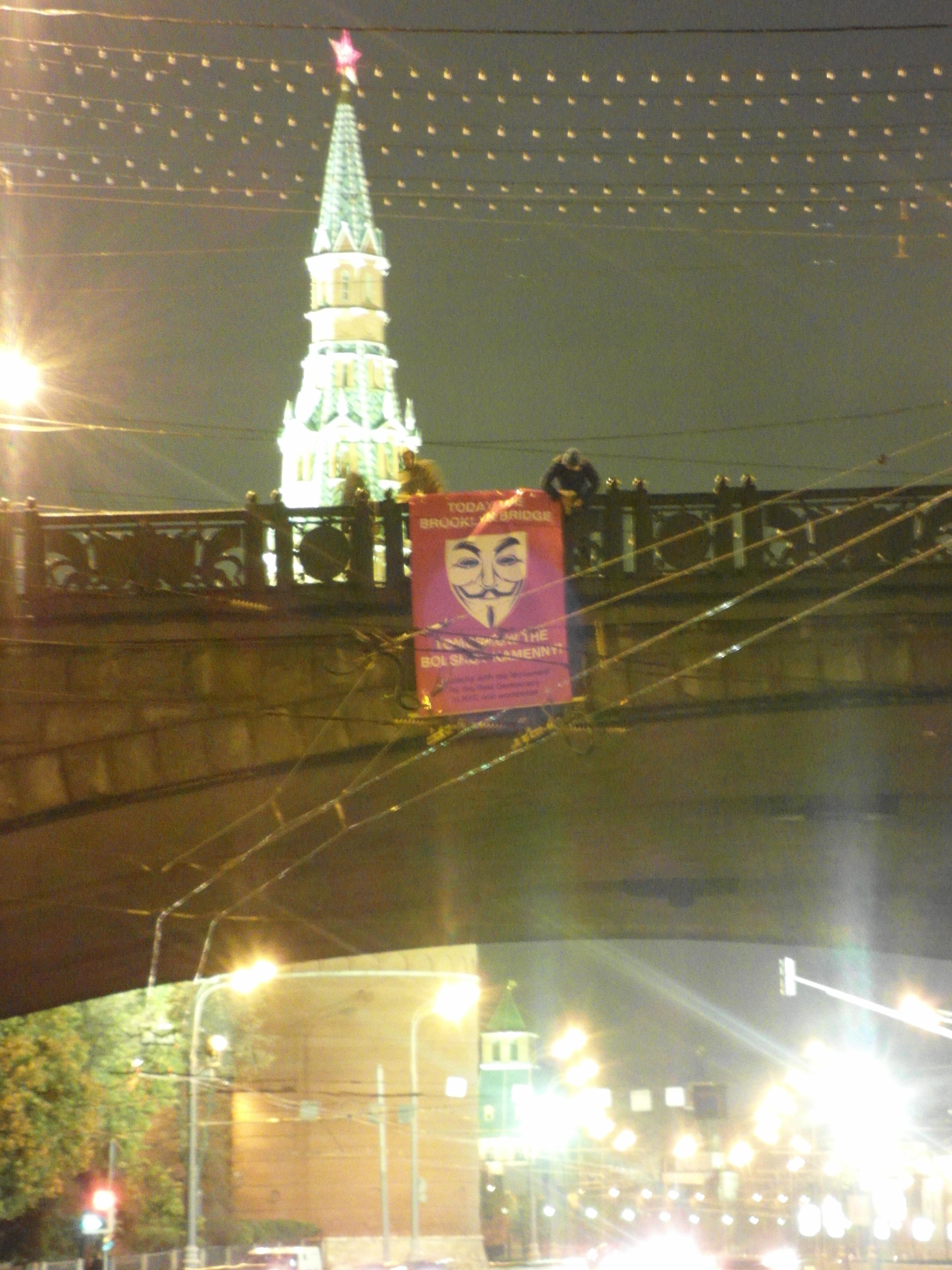 Ночью 15 октября, в международный день солидарности с «движением за реальную демократию» Occupy Wall Street российские левые и социальные активисты вывесили у Кремля на Большом Каменном мосту растяжку в знак солидарности с активистами в Нью-Йорке и во всем мире.Ранее участники движения Wall Street объявили о проведении в субботу масштабной акции протеста в самых разных странах мира.