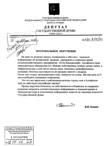 - К рукотворному уничтожению российской деревни вчера добавлена яркая картинка, когда в Алтайском крае, в Усть-Калманском районе целая группа деревень была выставлена на аукцион, дома вместе с жильцами, в связи с банкротством соответствующего хозяйства. К этому привело бездействие губернатора края, главы района и правоохранительных органов, - заявил В.Кашин. - Данный вопиющий случай ещё раз свидетельствует о бесчеловечном характере Жилищного кодекса и закона «О банкротстве», авторы которого находятся в этом зале. У меня протокольное поручение Комитету по собственности, аграрному комитету разобраться в этих безобразиях, напоминающих рабовладение.