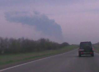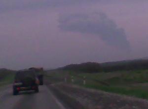 Вчера, едучи по трассе М-4 "Дон" довольно рано утром, обратил я внимание на странный столб то ли пыли, то ли дыма на горизонте. Дело было на севере Ростовской области, где-то в Чертковском районе. Утро было очень светлое, небо не то чтобы ни облачка, но довольно чистое - и вот на горизонте такое странное облако, идущее от самой земли очень далеко ввысь. В первую голову приходит мысль о пожаре, во вторую - о смерче. Собственно, в этих размышлениях о природе данного явления я и ехал примерно 35 километров, а столб то ли дыма, то ли пыли продолжал увеличиваться, и становилось ясно, что это все происходит не где-то там за горизонтом, а непосредственно по ходу движения, на трассе.