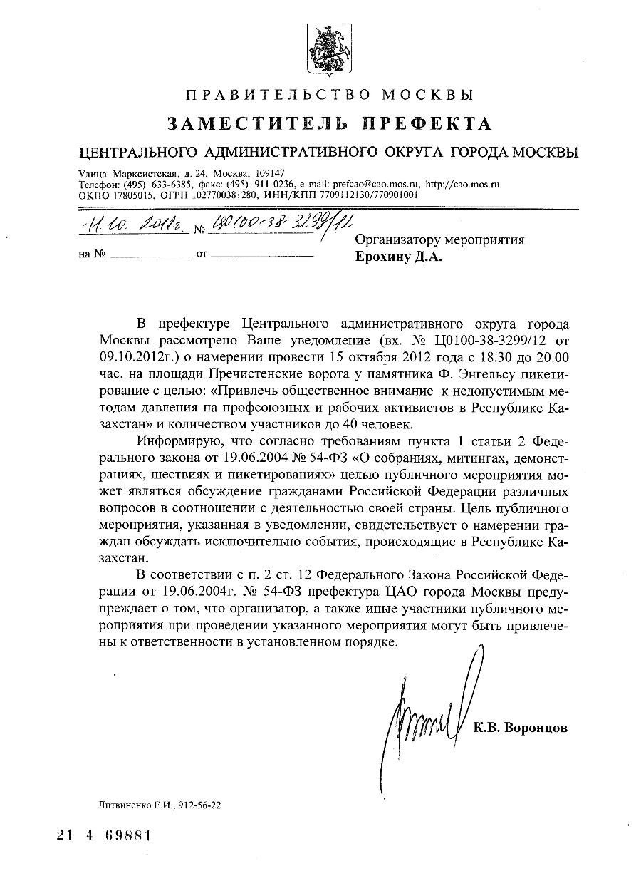 «Информирую, что согласно требованиям пункта 1 статьи 2 Федерального закона от 19.06.2004 №54 Ф-З «О собраниях, митингах, демонстрациях, шествиях, и пикетированиях» целью публичного мероприятия может являться обсуждение гражданами Российской Федерации различных вопросов в соотношении с деятельности своей страны. Цель публичного мероприятия, указанная в уведомлении, свидетельствует о намерении граждан обсуждать исключительно события, происходящие в Республике Казахстан».
