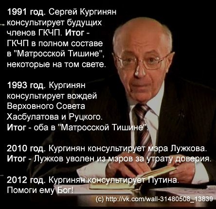 4. Путин простил Кургиняна за предвыборный антипутинский митинг (похоже, санкция была дана на поведение его после выборов, но Кургинян не понял), что делает его влиятельным, а сотрудничество с ним – полезным занятием. Конечно, это сотрудничество требует тошнотворных процедур: хотя бы формального признания величия Кургиняна и того, что любой желающий демократии по определению является шпионом госдепартамента и «белоленточным глистом». Кроме того, придется терпеть истеричность, нетерпимость к инакомыслию, игнорирование реальности, неприятие заметных способностей у других и иные профессиональные искажения личности, присущие некоторым театральным режиссерам, - но молодым карьеристам, готовым терпеть это, секта Кургиняна может открыть новые горизонты.
