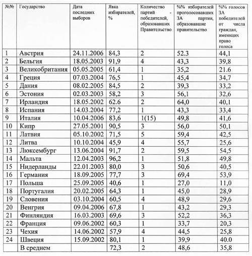 1. Абсолютные демократические победители, получившие поддержку более 50% голосов граждан, имеющих право голоса, - зафиксированы в 4 государствах: Кипр, Люксембург, Мальта, Германия.