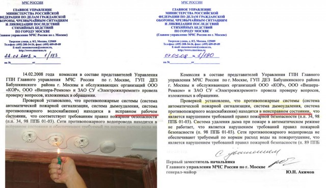 Написали в милицию, прокуратуру, еще куда-то, все-таки неизвестно на что потрачено несколько миллионов. Нет, не заинтересовало. Написали в МЧС и получили ответ за подписью большого начальника по фамилии Ю.Акимов, который с генеральской прямой написал, что та самая «система автоматической пожарной сигнализации, система дымоудаления, система противопожарного водоснабжения находятся в ИСПРАВНОМ РАБОЧЕМ СОСТОЯНИИ». Мол, в пожарных шлангах не понимаете, сидите и помалкивайте.