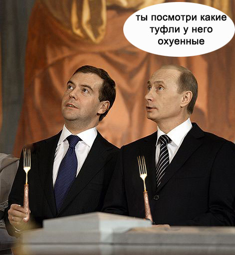Путин и особенно Медведев - действительно смешны, смешны объективно. Какие бы ужасные хари и еще более ужасные дела они не корчили. Два небольших человечка, притащившие во власть всю мерзость с самых подонков российского общества и надеющихся править всей этой сточной канавой? Самый их ужас - смешон, вот в чем дело. На плаху будут тащить, а все равно с них животики надорвешь. Вот такие мастера жанра.