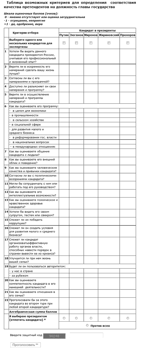 Подобная шкала напоминает весы Фемиды. На какой из двух чаш окажется больше «гирь», и что для того или иного эксперта-избирателя будет означать «больше»? Любопытства ради можно попробовать ответить на эти вопросы, «взвесив» указанных в таблице политических деятелей, кандидатов в президенты страны, и отобрав самого «тяжелого» из них по сумме положительных оценок. Сопоставив многочисленные результаты отбора, можно будет вероятностно оценить среднестатистический проходной балл каждого кандидата в президенты на предстоящих 4 марта этого года выборах.