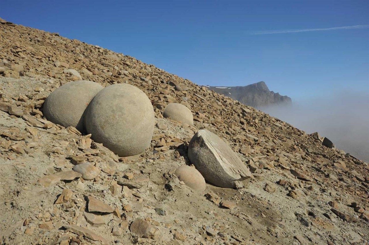 2. Шары расположены не в глубине земли, а в открытом доступе на поверхности, лежащие среди множества осколков мелких камней различной неправильной формы.