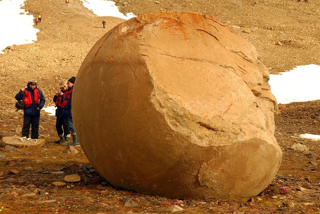Округлая форма шаров среди каменных россыпей говорит, что они не являются продуктом «слепой» природы. Надо заметить, что крупные шары, повернутые чуть набок, имеют небольшую вытянутость - «шею», вероятно, служившую им опорой в земле.