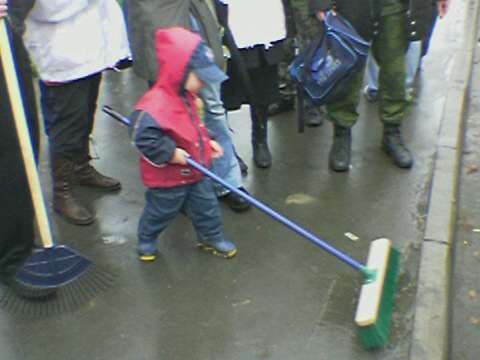 Отвели для субботника ПСС местные власти сравнительно небольшой участок газонов, детских площадок - как говорится, "примыкающих территорий". Но такого энтузиазма никто не ожидал. Сама уборка территории примерно метров в сто размахом заняла не более получаса. При этом вдохновение от согревающих в такой промозглый день действий сподвигло даже водрузить флаг ПСС на одном из деревьев посреди убираемой территории.