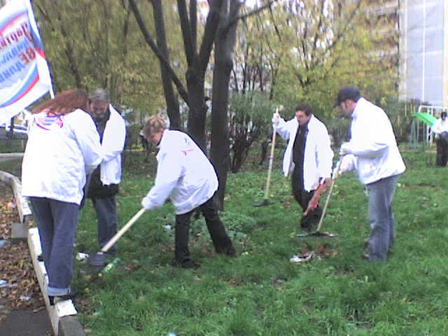 Покинув убранную территорию многие не раз оглянулись на флаг ПСС, реющий над газоном. Так простенько, но вполне конкретно агитирует реальными делами Партия социальной справедливости избирателей своих в Москве. Активисты заметили, что у политической партии ПСС всё есть, кроме первой буквы "к" - то есть это как бы КПСС, только без лишних заоблачных обещаний. Вот субботник - может запросто организовать и провести. Ничего больше, но и ничего меньше - заявленная цель достигнута, и продолжается работа. Какие еще будут у ПСС акции - глядите чаще за окна, товарищи.