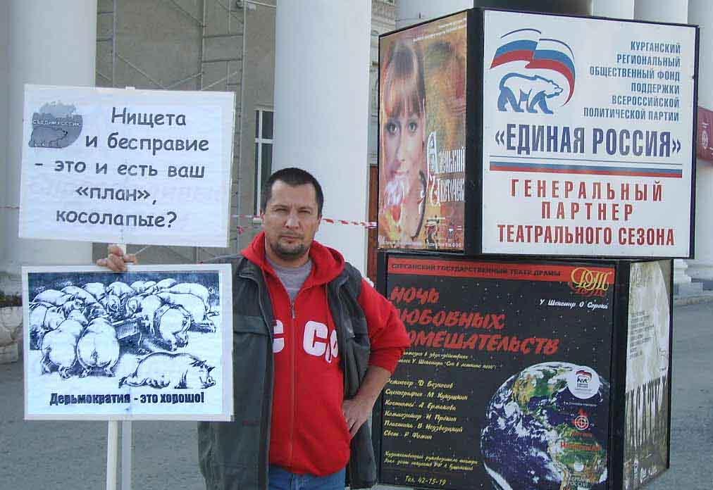 Два здания в центре площади, досталось пикетировать мне, Виктору Воденникову и Игорю Яковлеву. Только я встал с плакатом возле входа в Правительство Курганской области - дверь открылась, и вышел милиционер. Строго спрашивает:
