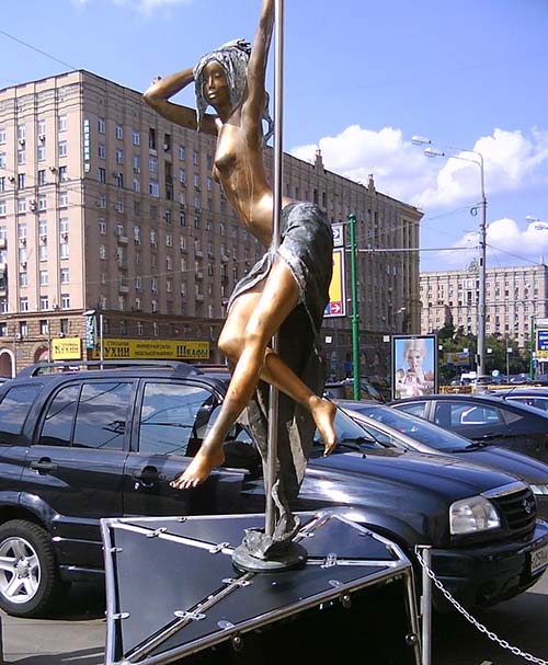 А может это шест не для стриптиза, а для прыжков в высоту, и скульптура изображает нашу прославленную попрыгунью в тот исторический момент, когда она дает справедливый отпор геям, лесбиянкам и другим толерастам? А топлес она прыгает исключительно для лучших результатов и прославления линии партии. Может и так.