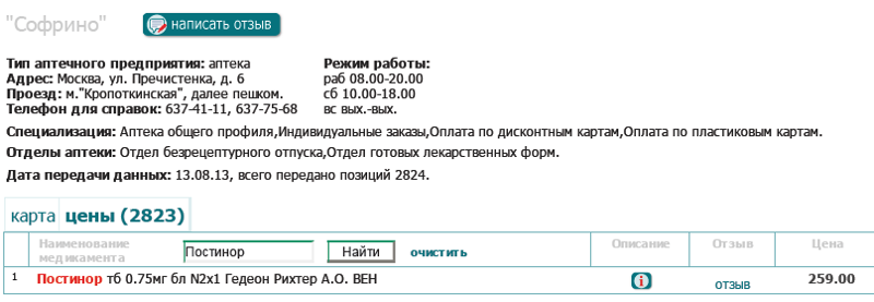 Однако выглядит так, что случай тот — не единичный, да и дело — далеко не прошлое. Например, выяснилось, что в ассортименте православной аптеки, принадлежащей торгово-производственному предприятию «Софрино», находящемуся под личным патронажем патриарха Кирилла, прямо сейчас есть не только смертногреховные презервативы, но и средства для медикаментозного прерывания беременности, или, по-другому, аборта! В частности, препарат «Постинор».
