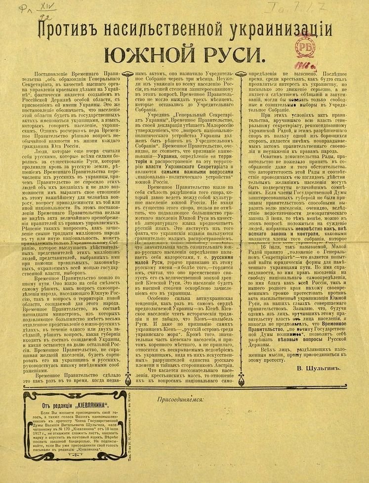 16 июля, так называемой, Малой Радой принято «положение о Генеральном Секретариате» — что является попыткой найти юридические формы для намеченного украинцами пути. Во имя справедливости, во имя прав населения на свободу национального самоопределения, во имя блага как всей России, так и нашего родного края нахожу своевременным громко протестовать против акта насильственной украинизации Южной Руси, на наших глазах совершаемого правительством. Заявляю, что, будучи одним из лиц, вручивших этому правительству власть от лица населения, я никогда не предполагал, что Временное Правительство, «по почину Государственной Думы возникшее», позволит себе разрешать вековые вопросы Русской Державы.